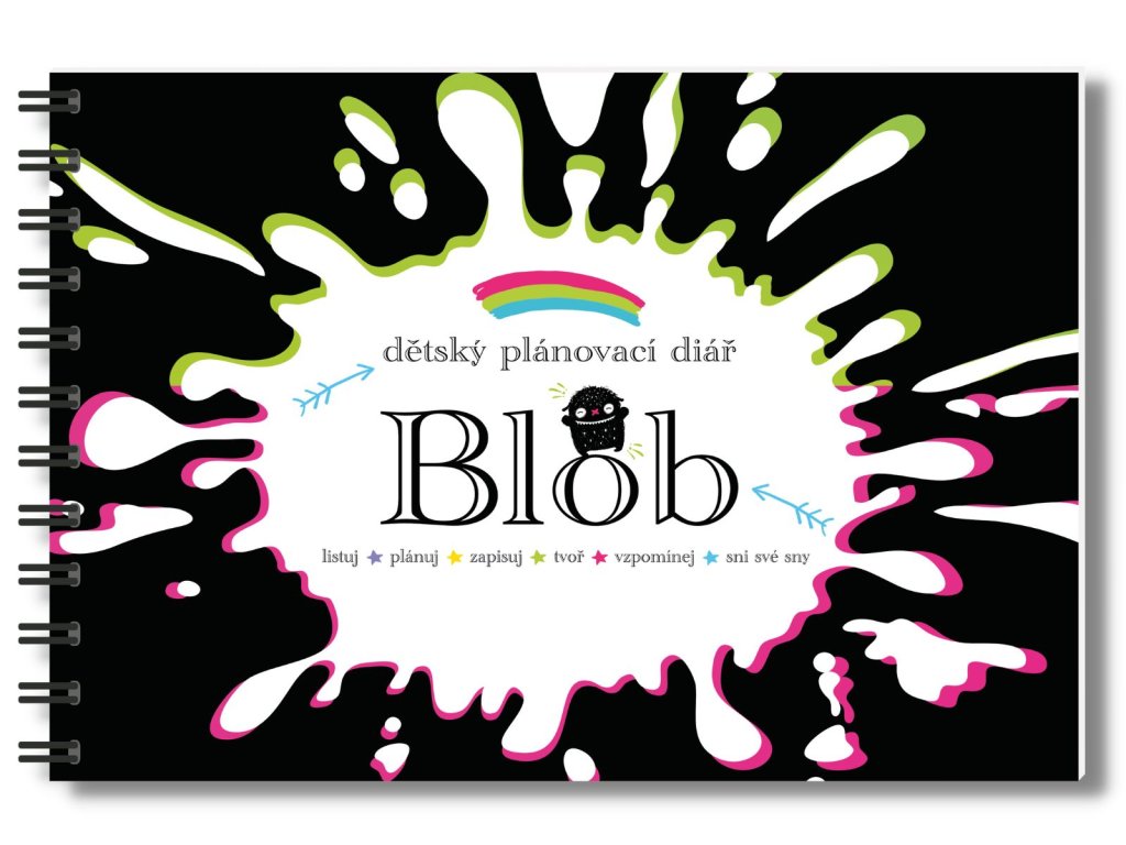 Dětský plánovací diář Blob je velkého formátu A4, obsahuje celkem 128 stran, má pevné, kašírované desky s laminací a kroužkovou vazbu s kovovou spirálou (diář lze zcela rozevřít, bez poškození vazby, což je ideální formát pro děti).